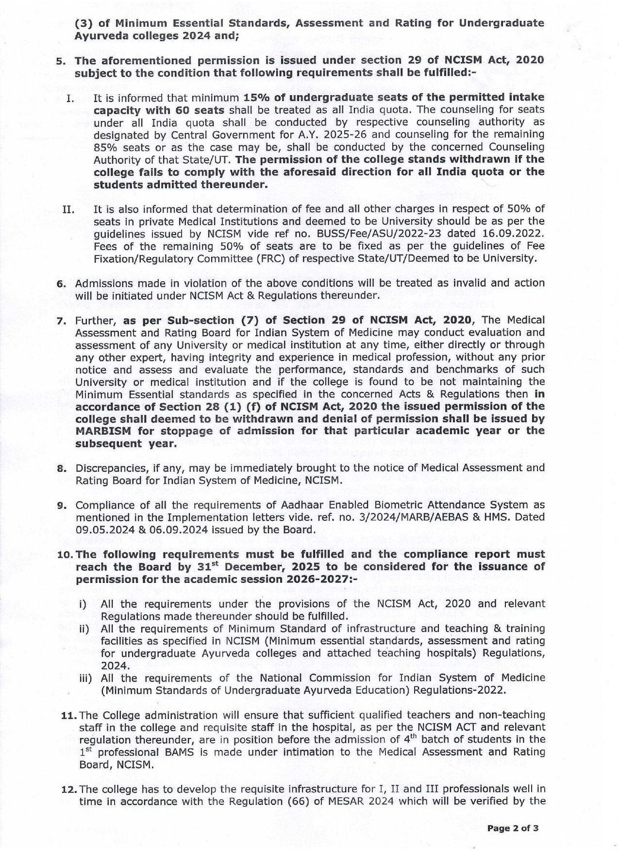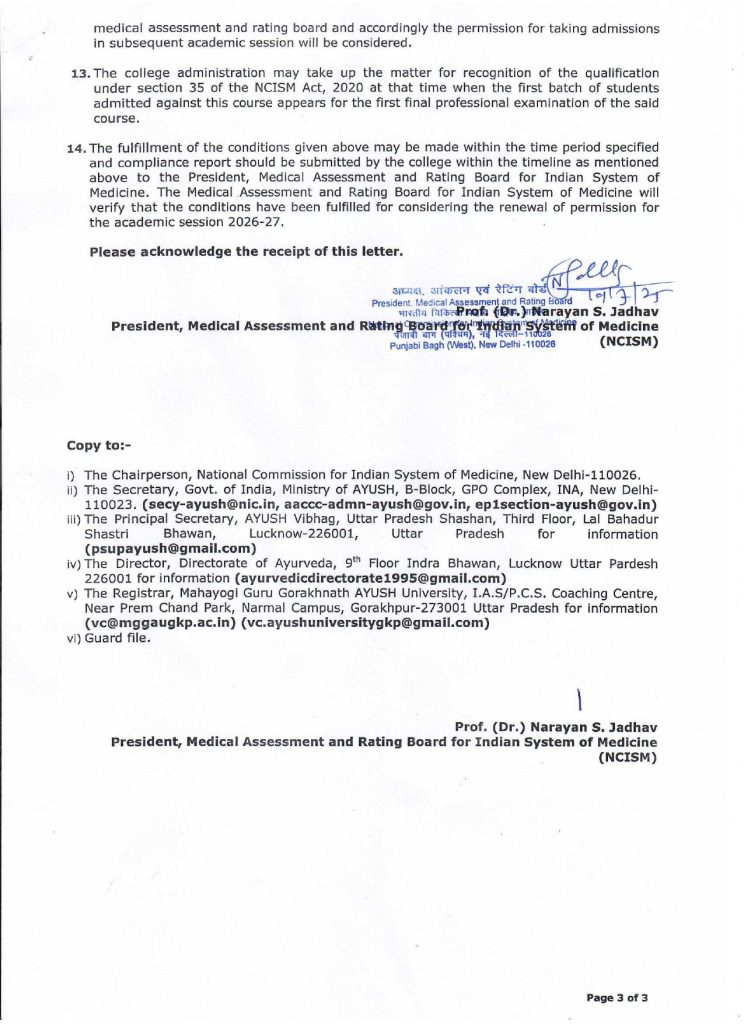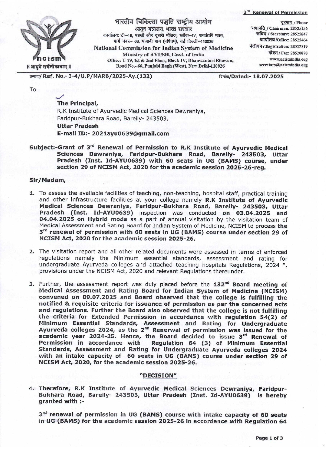 R.K Institute of Ayurvedic Medical Sciences Dewraniya, Faridpur-Bukhara Road, Bareilly- 243503, Uttar Pradesh (AYU0639) with 60 seats in UG (BAMS) course from the academic session 2025-26 under Section 29 of NCISM ACT 2020 and relevant regulations thereunder.
